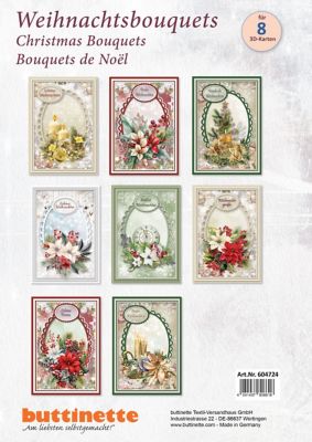 3D-Bastelmappe "Weihnachtsbouquets" für 8 3D-Karten. Inhalt: 8 farbige Doppelkarten (DIN A6), 8 bedruckte Auflege-Karten (DIN A6), 8 Umschläge (DIN C6), 2 Bogen mit je 4 Hintergrundpapieren (DIN A4), 2 Stanzbogen, 1 Bogen Klebepads und eine Anleitung.