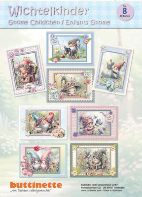 3D-Bastelmappe "Wichtelkinder" für 8 3D-Karten. Inhalt: 8 bedruckte Doppelkarten (DIN B6), 8 Umschläge (DIN B6), 4 Stanzbogen, 6 Lesezeichen, 12 Geschenkanhänger, 1 Bogen Klebestreifen und eine Anleitung.
