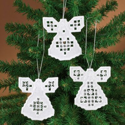 Hardanger-Aufhänger "Engelchen", im 3er-Pack. Komplettpackung: Anleitung, Zählvorlage, Garn, Sticknadel. Stofffarbe: weiß. Größe: 10 x 10 cm. Material: Stoff ( ca. 9 Fäden/cm) und Garn 100 % Baumwolle.