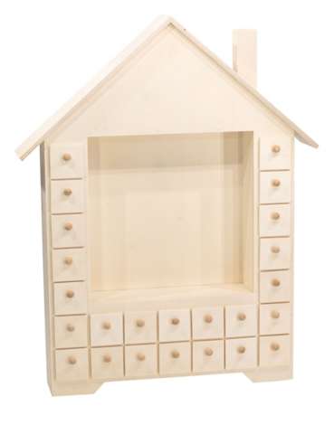 Adventskalender "Haus" aus Holz, mit 24 Schubladen, Farbe: natur, Größe: 37 x 48 x 7,5 cm, Maße Nische: 20,7 x 20,7 x 6 cm, Schubladengröße: 2,7 x 3,2 x 5,4 cm.