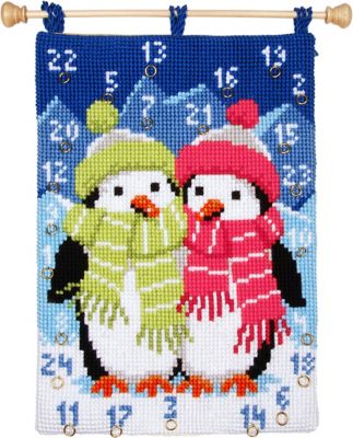 Adventskalender "Pinguine", zum Besticken in Kreuzstich. Komplettpackung: Anleitung, Garn, Sticknadel, 24 goldfarbene Ringe, Garn für Aufhängeschlaufen. Ohne Kalenderrücken und Aufhängestange. Größe: 53 x 40 cm. Material: Stoff handbemalter Stramin 100 % Baumwolle (ca. 18 Stiche/10 cm), Garn 100 % Polyacryl.