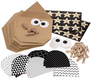 Adventskalender-Set "Eulen" aus Papier, Größe: 15 x 6,2 x 14 cm, Inhalt: 24 Tüten, Klebesticker mit Zahlen von 1–24, 24 selbstklebende Augen und Körperteile, 24 Holzklammern.