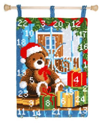 Adventskalender "Teddybär", zum Besticken in Kreuzstich. Komplettpackung: Anleitung, Garn, Sticknadel, 24 goldfarbene Ringe, Garn für Aufhängeschlaufen. Ohne Kalenderrücken und Aufhängestange. Größe: 53 x 40 cm. Material: Stoff handbemalter Stramin 100 % Baumwolle (ca. 18 Stiche/10 cm), Garn 100 % Polyacryl.