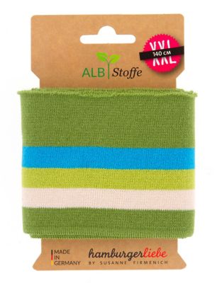 Albstoffe Bio-Strickbündchen "Cuff Me" aus der College-Serie, bi-elastisch, Farbe: grün-color, mit drei Streifen, Streifenbreite ecru: 8 mm, Breite: 7,5 cm, Länge: 1,4 m, Gewicht: ca. 510 g/m². Material: 95 % Baumwolle, 5 % Elasthan.