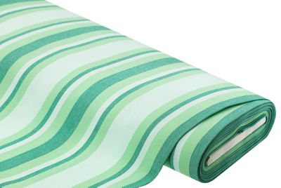 Allround-Gewebe "Madrid", gestreift, Farbe: grün-color, teflonbeschichtet, wasserabweisend, Lichtechtheit: 6, Streifen längs verlaufend, Breite: 160 cm, Gewicht: ca. 240 g/m². Material: 80 % Polyacryl, 20 % Polyester.
