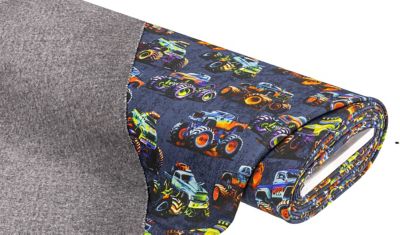 Alpenfleece "Monstertruck", Farbe: blau-color, bi-elastisch, Fleece-Rückseite in Grau, Motivgröße: 10 x 7,5 cm, Breite: 150 cm, Gewicht: ca. 350 g/m². Material: 66 % Baumwolle, 31 % Polyester, 3 % Elasthan.