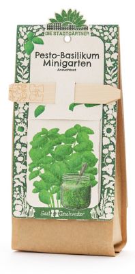 Anzuchtset – Minigarten "Basilikum" von Die Stadtgärtner, Inhalt: Bio-Saatgut für Basilikum (samenfest, ca. 120 Korn), Pflanzstäbchen, Anzuchterde, eine wasserfeste Verpackung, die als Pflanzgefäß genutzt wird und eine Anleitung.