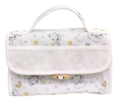 Baby-Beautycase, zum individuellen Besticken (unbestickt). Ein praktischer Begleiter für unterwegs, ob für Ihr eigenes Kind oder als Geschenk. Fertig konfektionierte Tasche aus Baumwollgewebe, mit attraktivem Holzknebel-Verschluss, Innenseite aus PVC zum einfachen Reinigen, mit einer bestickbaren Bordüre ca. 22 x 4,5 cm (ca. 5 Stiche/cm). Größe: 23 x 10 x 14 cm. Stofffarbe: weiß. Material: Stoff 100 % Baumwolle, Futter 100% PVC, Polsterung 100 % Polyester.