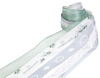 Bänderpaket "Konfirmation", Farbe: grün, Breite: 10–25 mm, Inhalt: 5x 2 m = 10 Meter. Material: 100 % Polyester.