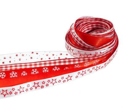 Bänderpaket "Weihnachten", Farbe: rot-weiß, Breite: 10 mm, Inhalt: 5x 2 m = 10 Meter. Material: 80 % Polyester, 20 % Polyamid.