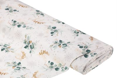Eukalyptuszweige sind momentan der Deko-Trend schlechthin! Überall sieht man die grünen, silbern schillernden Blätter – jetzt auch in brillantem Druck auf diesem Stoff. Dekorieren Sie Ihre Wohnung mit selbstgenähten Kissen, Läufern, Überwürfen oder auch für Geschenkssäckchen. Das Weihnachts-Motiv wird Sie vom ersten Moment an verzaubern – freuen Sie sich drauf!