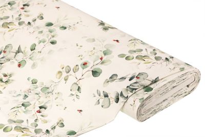 Mit Tischläufern, Tischsets, Überwürfen oder Kissen aus diesem hübschen frühlingshaften Canvas erstrahlen Ihre vier Wände in neuem Glanz. Der hochwertige Baumwoll-Dekostoff ist mit einem schönen botanischen Muster aus Eukalyptuszweigen und Marienkäfern bedruckt. Da der Stoff relativ fest und formstabil ist, kann er auch problemlos zu modischen Taschen vernäht werden. Bestellen Sie am besten gleich und überzeugen Sie sich selbst von der wunderbaren Optik und Qualität des Baumwollstoffes.