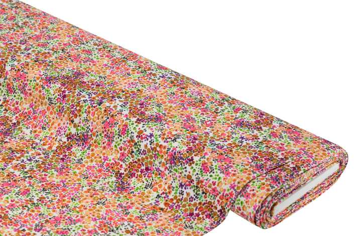Baumwoll-Jersey „Blümchen“ mit Elasthan, Farbe: bunt, bi-elastisch, Motivgröße Blümchen ocker groß: 1 cm Ø, Breite: 155 cm, Gewicht: ca. 195 g/m². Material: 92 % Baumwolle, 8 % Elasthan.