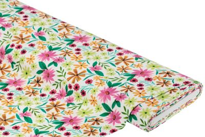 Der sommerliche florale Print des Baumwoll-Elastik-Jerseys sieht aus wie handgemalt und versprüht Sommerfeeling pur – das macht den feinen Jersey-Stoff zur idealen Wahl für große und kleine Blumenkinder! Nähen Sie bequeme Shirts, Kleider, Leggings oder Röcke, die jede Bewegung mitmachen und dank hochwertiger Baumwolle angenehm zu tragen sind. Auch Accessoires wie Mützen und Schals oder Home Textilien wie Kissenbezüge, Regalvorhänge oder Bettwäsche aus dem Blumenstoff sind möglich. Gleich bestellen und schon bald Traumteile nähen!