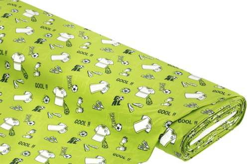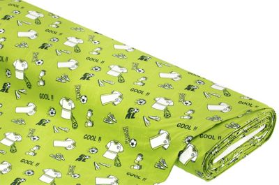 Baumwoll-Jersey „Fußball“ mit Elasthan, Farbe: grün-color, bi-elastisch, Motivgröße Trikot: 4 x 4 cm, Breite: 150 cm, Gewicht: ca. 200 g/m². Material: 95 % Baumwolle, 5 % Elasthan.