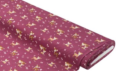 Exklusiv von buttinette: Baumwoll-Jersey "Rehlein" mit Elasthan, Farbe: mauve, bi-elastisch, Motivgröße liegendes Reh: 2 x 3 cm, Breite: 150 cm, Gewicht: ca. 200 g/m². Material: 95 % Baumwolle, 5 % Elasthan.