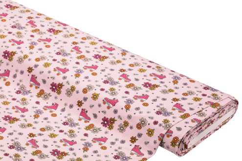 Baumwoll-Jersey „Rollschuhe“ mit Elasthan, Farbe: rosé-color, bi-elastisch, Motivgröße Rollschuh: 3 x 3 cm, Breite: 145 cm, Gewicht: ca. 185 g/m². Material: 95 % Baumwolle, 5 % Elasthan.