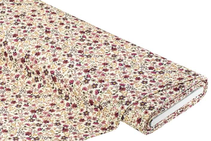 Baumwoll-Rippjersey-Digitaldruck „Blumen“ mit Elasthan, Farbe: natur-color, querelastisch, Rippenbreite: 2 mm, , Motivgröße große Blüten: 1,5 cm Ø, Breite: 120 cm, Gewicht: ca. 220 g/m². Material: 95 % Baumwolle, 5 % Elasthan.