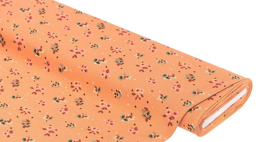Baumwoll-Waffeljersey „Blumen“ mit Elasthan, Farbe: lachs-color, bi-elastisch, Motivgröße Drei-Blumen-Pink: 3,5 x 3 cm, Breite: 145 cm, Gewicht: ca. 235 g/m². Material: 95 % Baumwolle, 5 % Elasthan.