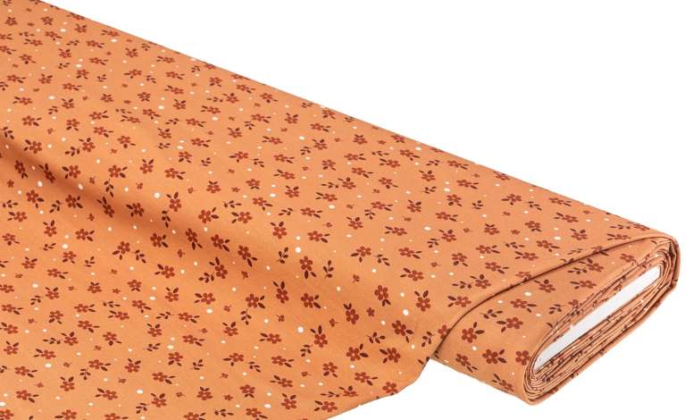 Baumwolljersey "Blümchen" mit Elasthan, Farbe: braun-color, bi-elastisch, Motivgröße Blume: 1,5 cm Ø, Breite: 150 cm, Gewicht: ca. 230 g/m². Material: 94 % Baumwolle, 6 % Elasthan.