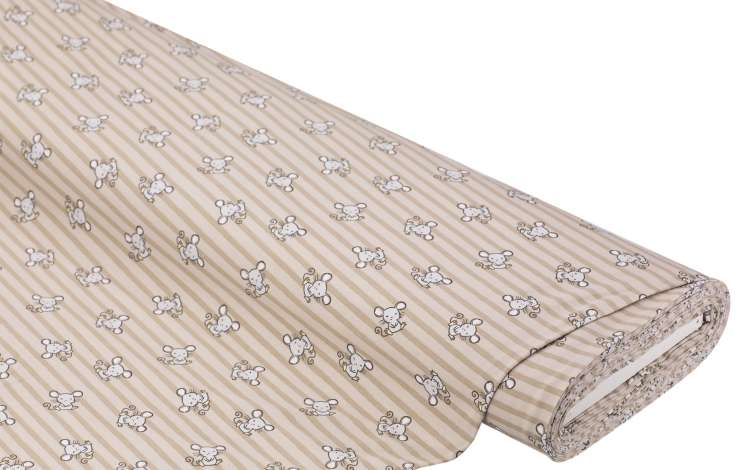 Baumwolljersey "Kleine Maus" mit Elasthan, Farbe: taupe-color, bi-elastisch, quer gestreift, Motivgröße Maus: 2,5 x 3 cm, Breite: 160 cm, Gewicht: ca. 170 g/m². Material: 95 % Baumwolle, 5 % Elasthan.