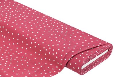 Baumwolljersey "Punkte", Farbe: beere/weiß, Tupfengröße: 5 mm Ø, Breite: 165 cm, Gewicht: ca. 160 g/m². Einlaufwerte: min. 3 - 5 % in Breite und Länge. Material: 100 % Baumwolle.