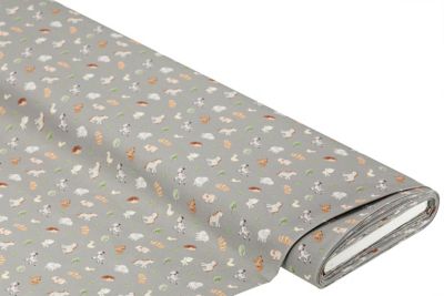 Exklusiv von buttinette: Baumwollstoff "Bauernhof", Farbe: grau-color, aus der Quiltserie "Dana", in brillantem Digitaldruck, aus weicher Baumwolle, Motivgröße Pferd: 2 x 2,4 cm, Breite: 150 cm, Gewicht: ca. 120 g/m². Material: 100 % Baumwolle.