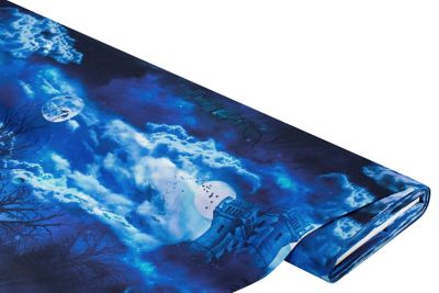 Exklusiv von buttinette: Baumwollstoff-Digitaldruck "Grusel-Nacht" aus der Serie "Ria", Farbe: blau-color, Breite: 160 cm, Gewicht: ca. 110 g/m². Einlaufwert: ca. 3–5 % in Länge und Breite. Material: 100 % Baumwolle.