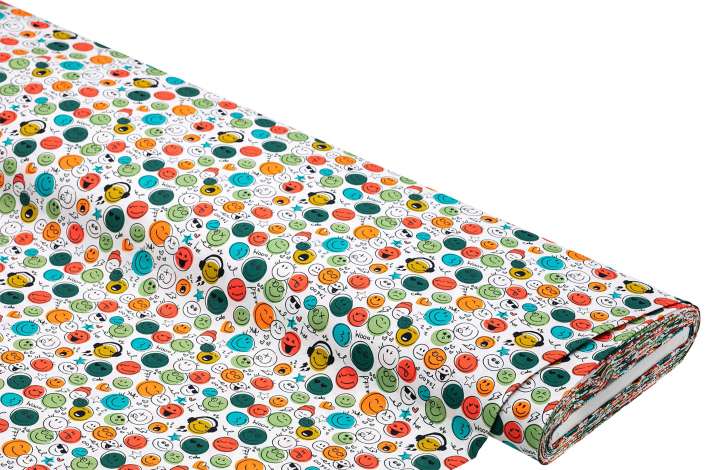 Exklusiv von buttinette: Baumwollstoff "Lustige Gesichter", Farbe: weiß-color, aus der Quiltserie "Dana", in brillantem Digitaldruck, aus weicher Baumwolle, Motivgröße Gesicht mit Kopfhörer: 2,5 cm Ø, Breite: 150 cm, Gewicht: ca. 120 g/m². Material: 100 % Baumwolle.