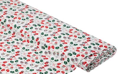Exklusiv von buttinette: Baumwollstoff "Handschuhe", Farbe: weiß/grün/rot, aus der Quiltserie "Mona", aus besonders feiner, weicher und hochveredelter Baumwolle (Renforcé), Motivgröße Handschuh: 1,5 x 2 cm, Breite: 150 cm, Gewicht: ca. 130 g/m². Material: 100 % Baumwolle.