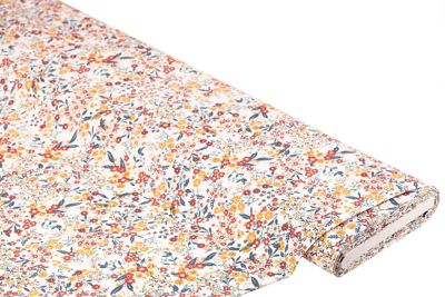 Exklusiv von buttinette: Baumwollstoff "Kleine Blümchen", Farbe: weiß-color, aus der Quiltserie "Lena", aus besonders feiner, weicher und hochveredelter Baumwolle (Renforcé), Motivgröße Blümchen: 2–12 mm Ø, Breite: 150 cm, Gewicht: ca. 130 g/m². Material: 100 % Baumwolle.