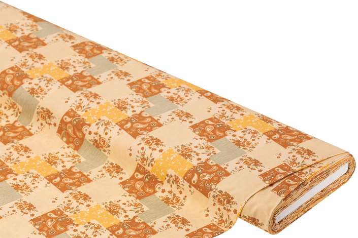 Exklusiv von buttinette: Baumwollstoff "Patchwork-Rosen", Farbe: gelb-color, aus der Quiltserie "Mona", aus besonders feiner, weicher und hochveredelter Baumwolle (Renforcé), Motivgröße Quadrat: 5,2 x 5,2 cm, Breite: 150 cm, Gewicht: ca. 130 g/m². Material: 100 % Baumwolle.