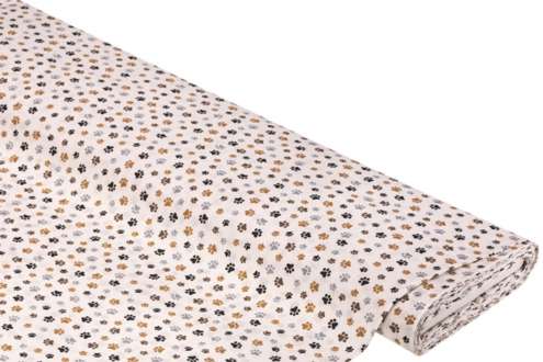 Exklusiv von buttinette: Baumwollstoff "Pfoten", Farbe: weiß-color, aus der Quiltserie "Mona", aus besonders feiner, weicher und hochveredelter Baumwolle (Renforcé), Motivgröße Pfote groß: 1 x 1 cm, Breite: 150 cm, Gewicht: ca. 130 g/m². Material: 100 % Baumwolle.