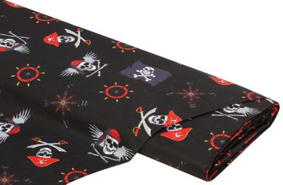 Baumwollstoff Piraten & Co. für Dekorationen, Kostüme uvm., perfekt auch für die Kleinen: Verwandeln Sie das Kinderzimmer mit diesem Stoff in ein unvergleichbares Abenteuerparadies, Farbe: schwarzgrundig, Motivgröße Flagge: 6 x 4,5 cm, Breite: 140 cm, Gewicht: ca. 130 g/m². Material: 100 % Baumwolle.