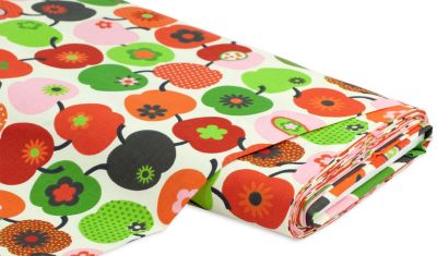 Hübscher Baumwollstoff "Retro-Apfel", Farbe: rot/grün, Motivgröße: 4,5 x 5,5 cm (ohne Stiel), Breite: 160 cm, Gewicht: ca. 140 g/m². Material: 100 % Baumwolle.