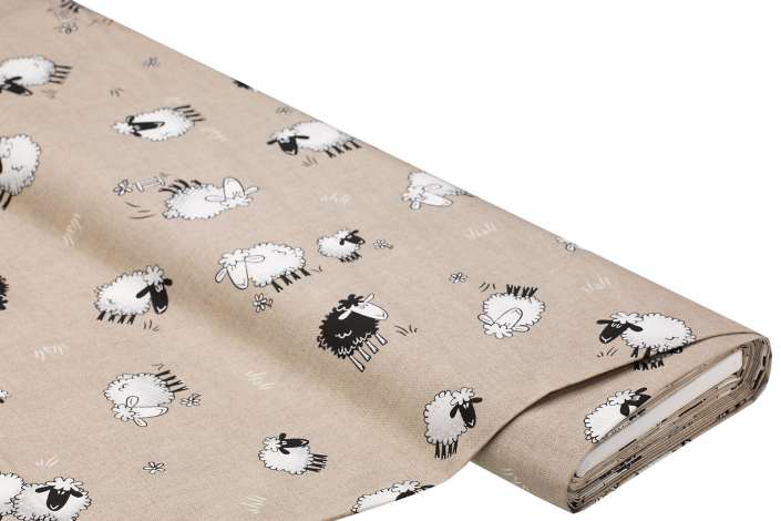 Baumwollstoff "Schäfchen", Farbe: beige-color, Motivgröße schwarzes Schaf: 5,5 x 6 cm, Breite: 140 cm, Gewicht: ca. 140 g/m². Material: 100 % Baumwolle.