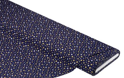 Exklusiv von buttinette: Baumwollstoff "Sternchen", Farbe: blau/gold/weiß, mit goldenem Glitzerdruck, aus der Quiltserie "Mona", aus besonders feiner, weicher und hochveredelter Baumwolle (Renforcé), Motivgröße: 5–10 mm. Breite: 150 cm, Gewicht: ca. 130 g/m². Material: 100 % Baumwolle.