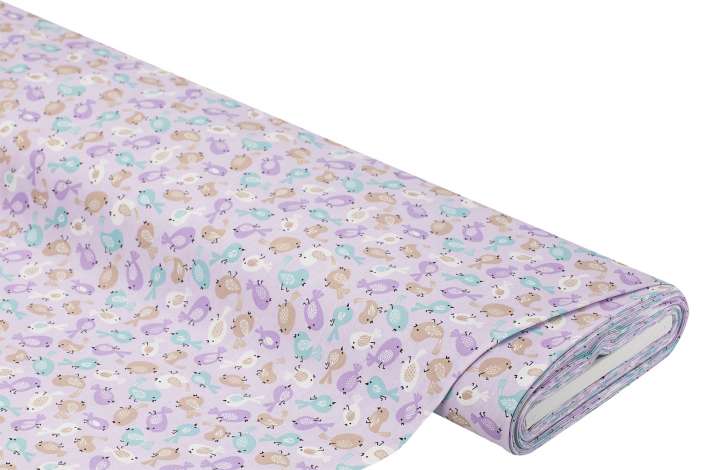 Exklusiv von buttinette: Baumwollstoff "Vögelchen", Farbe: flieder-color, aus der Quiltserie "Mona", aus besonders feiner, weicher und hochveredelter Baumwolle (Renforcé), Motivgröße Vogel: 3–3,5 cm, Breite: 150 cm, Gewicht: ca. 130 g/m². Material: 100 % Baumwolle.