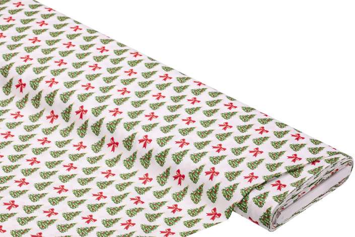 Exklusiv von buttinette: Baumwollstoff "Weihnachtsbaum & Schleifen", Farbe: weiß-color, aus der Quiltserie "Sina", aus besonders feiner, weicher und hochveredelter Baumwolle (Renforcé), Motivgröße Schleife: 1,8 cm Ø, Breite: 150 cm, Gewicht: ca. 130 g/m². Material: 100 % Baumwolle.