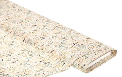 Baumwollstoff "Wiesengräser", Farbe: natur-color, Motivgröße Blüten: 5–25 mm Ø, Breite: 145 cm, Gewicht: ca. 140 g/m². Material: 100 % Baumwolle.