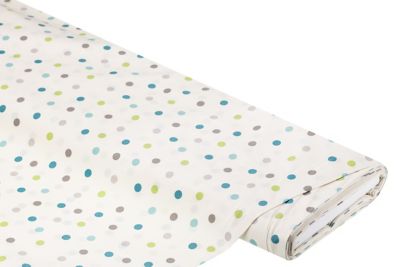 Beschichteter Baumwollstoff mit bunten Tupfen, Tupfengröße: 1 cm Ø, Farbe: ecru/petrol, Breite: 155 cm, Gewicht: ca. 170 g/m², Einlaufwerte: ca. 2 % in Länge und Breite. Material: Grundmaterial 100 % Baumwolle, Beschichtung 100 % Polyacryl.