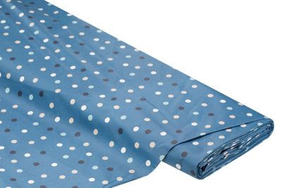Beschichteter Baumwollstoff mit bunten Tupfen, Tupfengröße: 1 cm Ø, Farbe: jeans-color, Breite: 155 cm, Gewicht: ca. 170 g/m², Einlaufwerte: ca. 2 % in Länge und Breite. Material: Grundmaterial 100 % Baumwolle, Beschichtung 100 % Polyacryl.