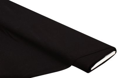Bio-Baumwolljersey mit Elasthan, Farbe: schwarz, bi-elastisch, Breite: 180 cm, Gewicht: ca. 200 g/m². Einlaufwert: 3–5 % in Länge und Breite. Material: 95 % Baumwolle, 5 % Elasthan.