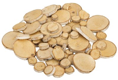 Birkenscheiben, rund, Größe: ca. 2–6 cm Ø, Stärke: 5–8 mm, Inhalt: 250 g = ca. 60–70 Stück, je nach Anfall.