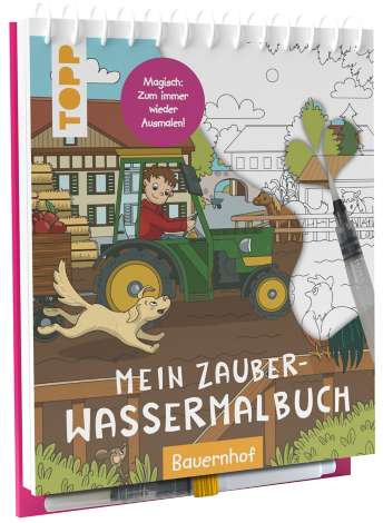 "Mein Zauber-Wassermalbuch – Bauernhof". Mit dem beigefügten Wasserstift zauberst du Farbe in die liebevoll gestalteten Bauernhof-Motive. Einfach mit der Spitze des gefüllten Wasserstifts über die Motive malen und schon werden versteckte Elemente und Details durch das Wasser sichtbar. Zusätzlich gibt es auf jedem Bild Fehler zu entdecken. Nach dem Trocknen können die Bilder erneut bemalt werden – für unendlichen Malspaß, ob Zuhause oder unterwegs. Für Kinder ab 3 Jahren. Block mit 16 Seiten. Größe: 21 x 16 cm.