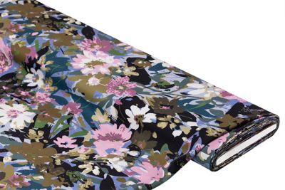 Ein traumhafter Stoff für ganz besondere Hingucker-Teile: Wie ein kunstvolles Blumen-Stillleben wirkt das opulente Blumendesign vor schwarzem Hintergrund. Nähen Sie daraus feminine Mode wie Blusen, Tuniken, Kleider oder Röcke. Der seidenweiche Webstoff hat einen fließenden Fall und liegt wunderbar angenehm auf der Haut.