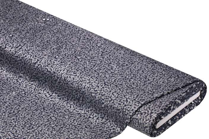 Blusenstoff mit Pailletten, Farbe: blau-silber, Paillettengröße: 5 mm Ø, Pailletten angenäht, Breite: 140 cm, Nutzbreite: 130 cm, Gewicht: ca. 265 g/m². Material: 100 % Viskose, Pailletten: 100 % Polyester.