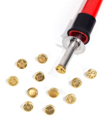 Brennstempel für Brandmalkolben, Inhalt: 12 Stück, Motive: 2x Blume, 2x Raute, 2x Mond, 2x Kreis, 2x Herz, 2x Stern. Größe Motiv: 1 cm.