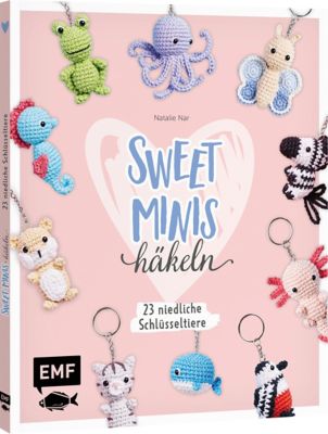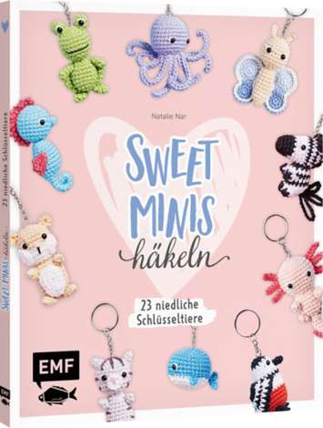 "Sweet Minis häkeln – 23 niedliche Schlüsseltiere". Von Hund über Seepferdchen bis zum Axolotl – die Häkeltiere sind schnell umgesetzt, anfängertauglich und benötigen nur eine geringe Menge an Garn. Perfekt als Geschenk, aber auch zum selbst behalten als Schlüsselanhänger, Taschenschmuck, Glücksbringer oder niedliche Deko. Vorsicht, Suchtgefahr! Buch mit 48 Seiten. Größe: 17,5 x 21,5 cm.