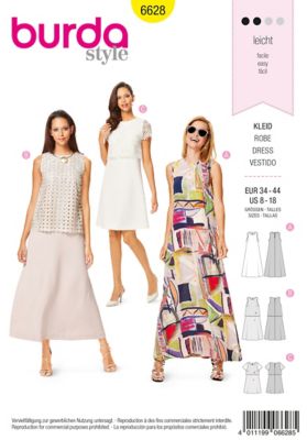 Mit diesem burda-Schnittmuster 6628 sind Sie flexibel – es bietet nämlich gleich drei Varianten für ein schickes Kleid in A-Linie: Das bodenlange, ärmellose Maxi-Kleid mit kleinem Stehkragen (Modell A) erinnert an die Seventies. Stoffe mit großen Prints, z. B. Blumen oder geometrische Designs, kommen hier wunderbar zur Geltung. Das bodenlange Kleid wird unten weit; dadurch ist es schön luftig und lässt sich an heißen Sommertagen gut tragen. Modell B hingegen sorgt mit einem darüber getragenen und an den Ausschnittkanten mitgefassten Top aus Effektstoff für einen lässig-eleganten Auftritt im Layering-Look. Geradezu mädchenhaften Charme bietet Modell C: Das Hängerkleid verzaubert mit dem darüber getragenen und an den Ausschnittkanten mitgefassten Spitzentop – eine wunderbare Idee für ein festliches Outfit oder sogar ein Brautkleid!